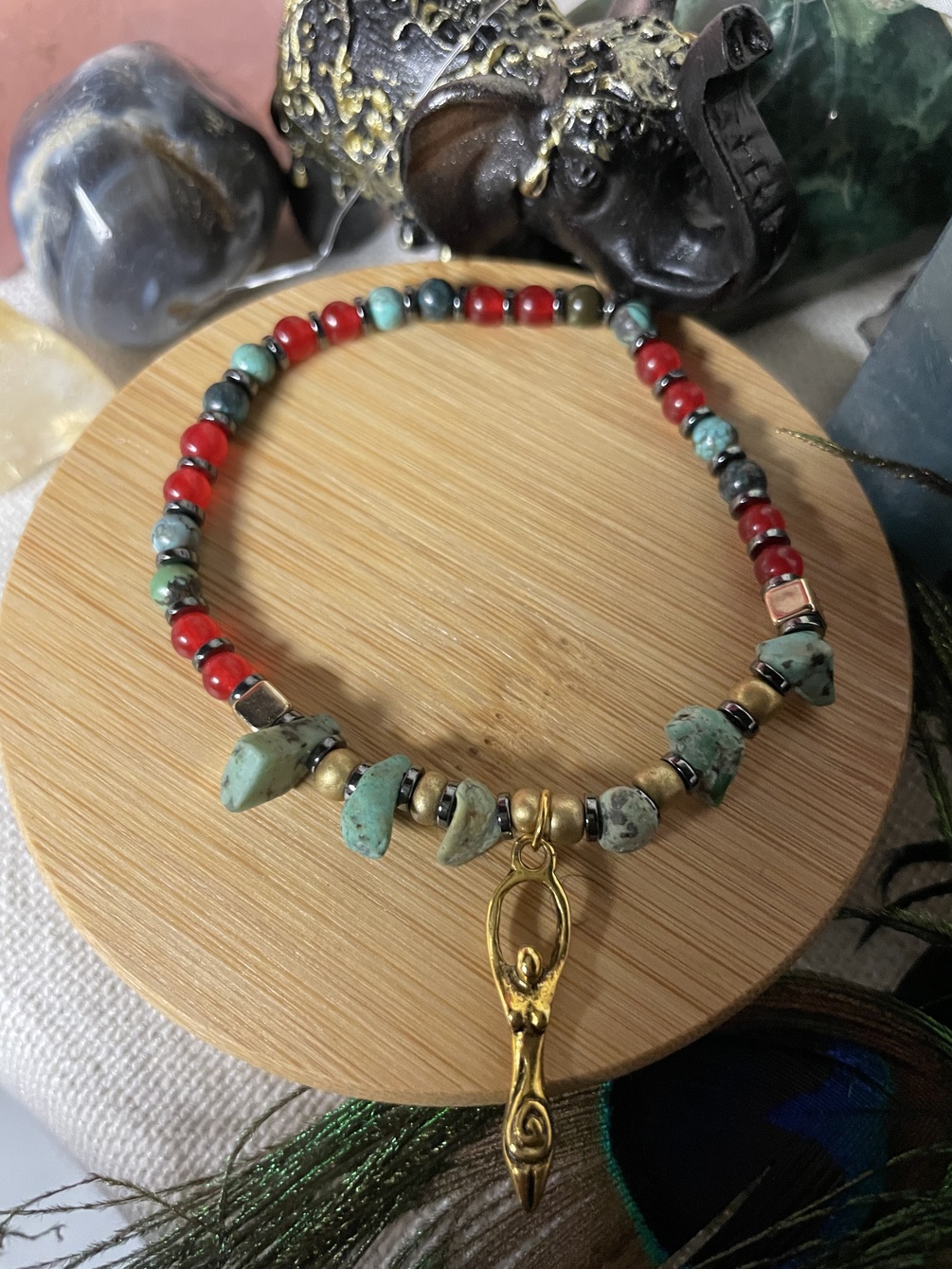 One handmade beaded turquoise and jade bracelet with a goddess charm