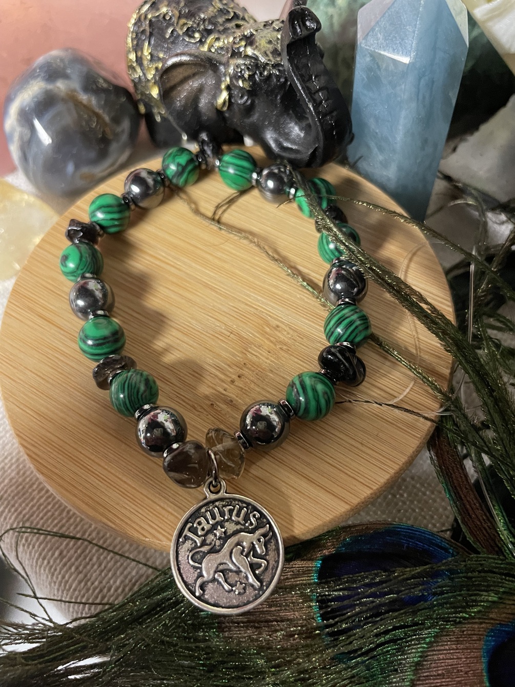 One handmade beaded Malachite, Hematite, & Smoky Quartz bracelet with optional charm